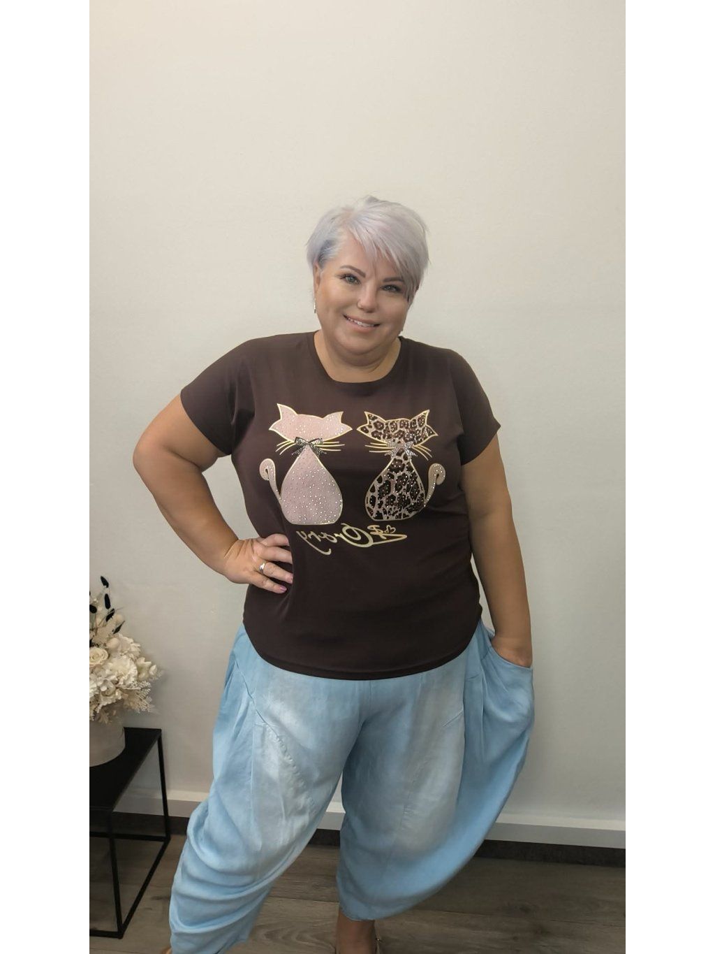 Volnější střih krásně pracuje s postavou, schová boky i stehna a díky pružnému pasu se dokonale přizpůsobí.