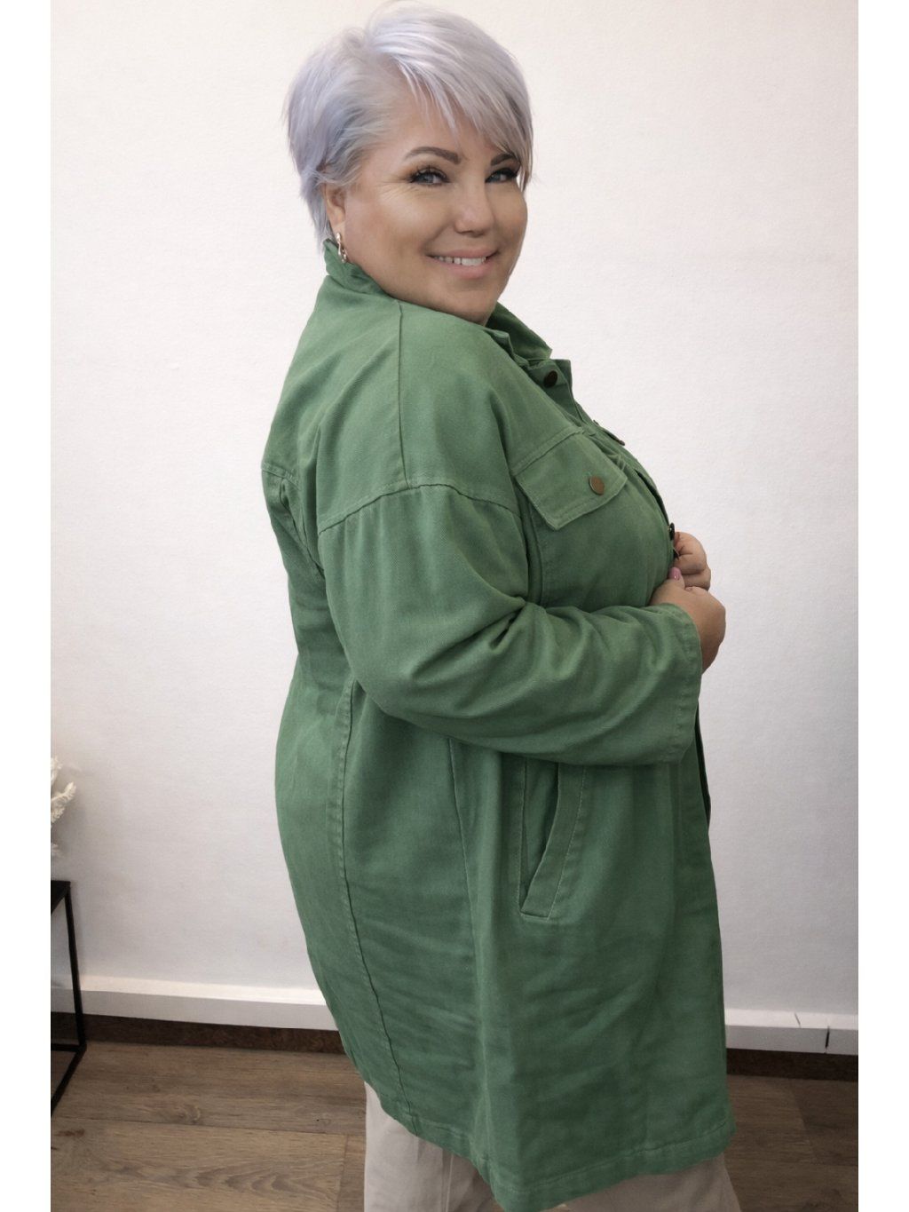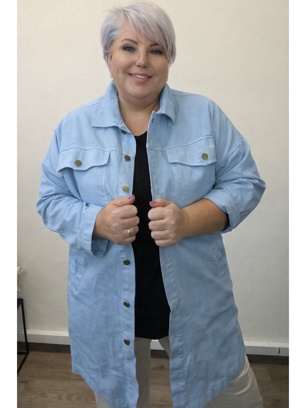 Tento dámský riflový kabát je skvělou volbou i pro ženy, které hledají plus size oblečení – střih je pohodlný, neobepíná a přizpůsobí se postavě.