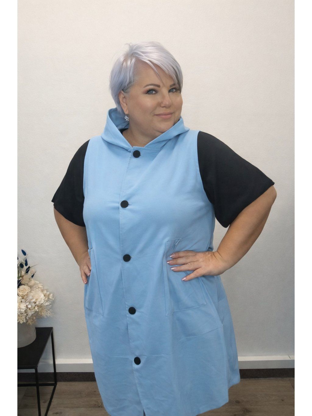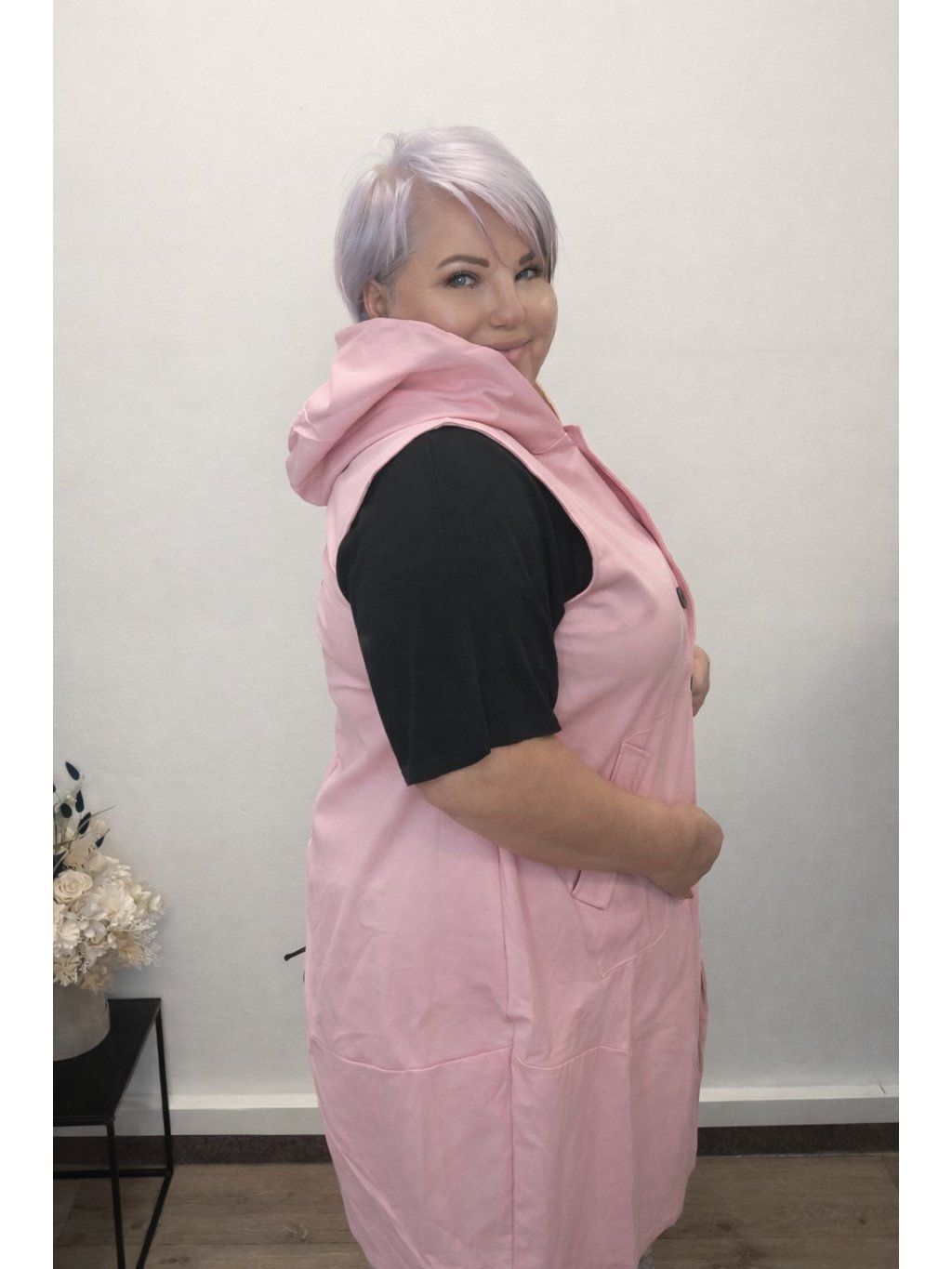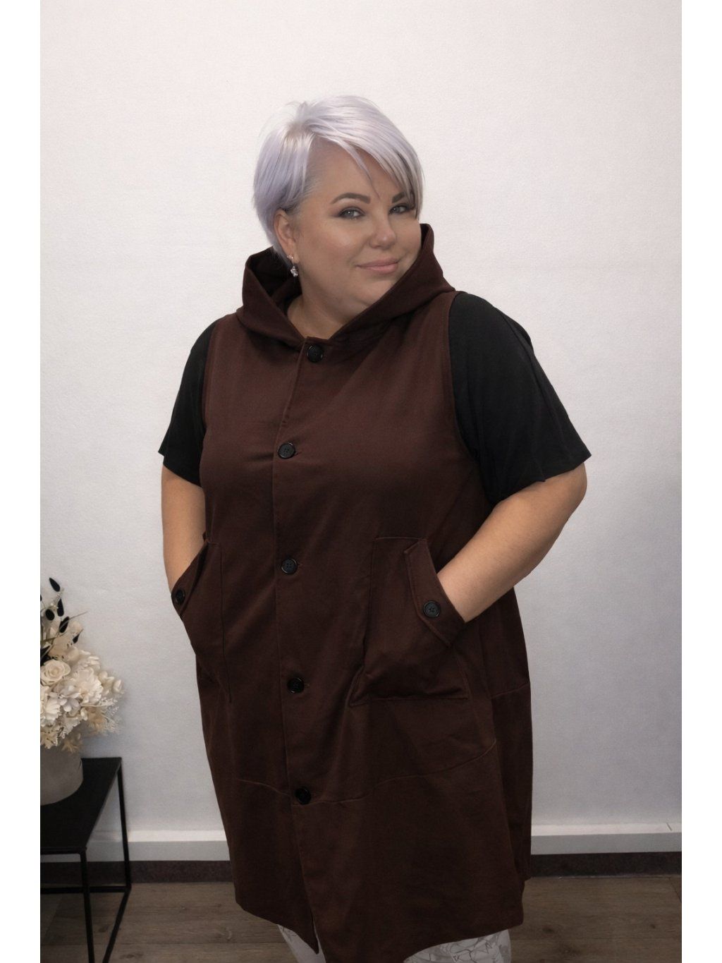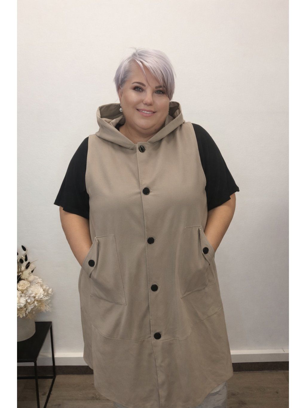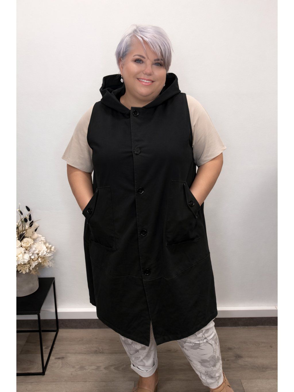 Volnější střih zajistí maximální pohodlí a zároveň lichotivě sedí i na plnějších tvarech. Praktické kapsy a zapínání na knoflíky dělají z vesty nejen stylový, ale i funkční kousek.